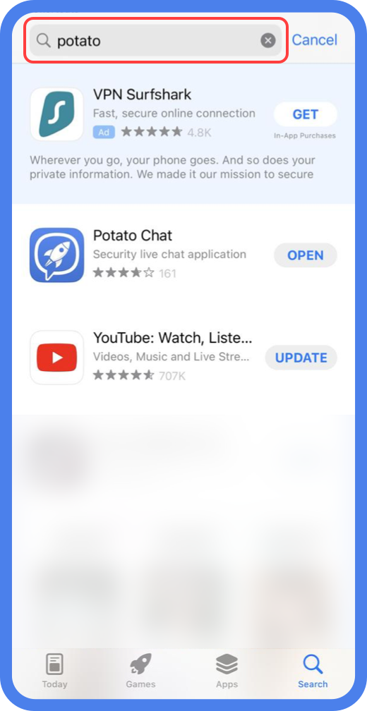 点击更改之后会自动跳转到AppStore,在搜索框内搜索Potato应用,能搜索到,说明地区已经更改成功了。